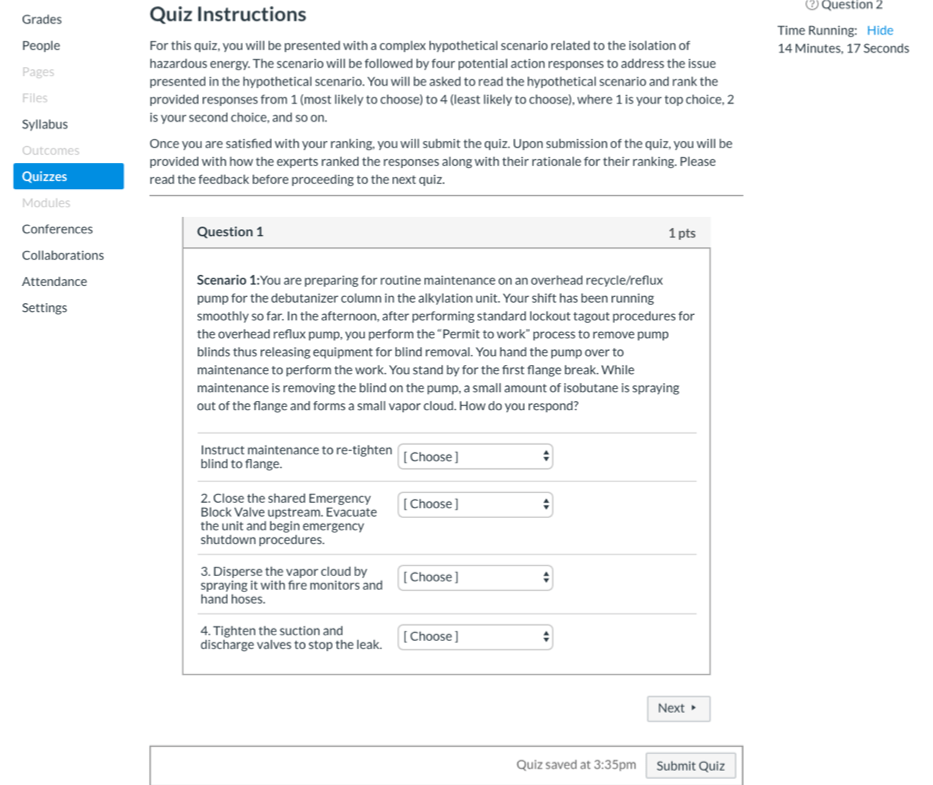 Utilizing an approach similar to Gary Klein’s ShadowBox, expert feedback and rationale for decision making were extracted and incorporated in the training module. The module was then inserted into the course curriculum for petrochemical refinery field operators. Students in those courses were divided into two groups: One group was provided with feedback in the form of the experts’ ranking, and the other group was provided with feedback in the form of the experts’ ranking as well as the rationale behind their ranking. Participants were also asked to complete post-study questionnaires, including the System Usability Scale (SUS) and the Need for Cognition scale.