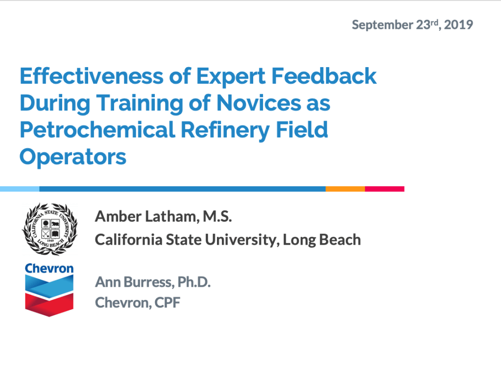 I conducted research for my master’s thesis, Effectiveness of Expert Feedback During Training of Novices as Petrochemical Refinery Field Operators, at the Chevron refinery in El Segundo.